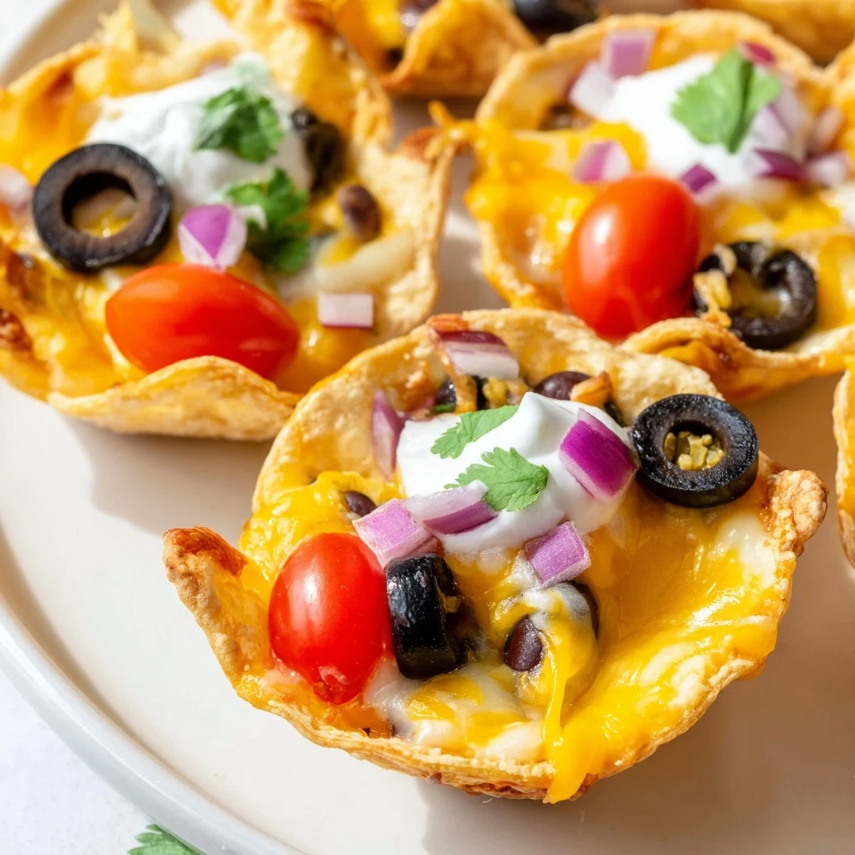 These miniature crispy tortilla cups deliver all the classic nacho flavors in a handheld format. Simply arrange scoop-style chips in a mini muffin tin, fill with shredded cheddar and Monterey Jack cheese, then top with black beans, diced cherry tomatoes, sliced black olives, jalapeños, and red onion. After 8-10 minutes in the oven, you'll have bubbly, golden cups that are perfect for grabbing and going. Finish with sour cream and fresh cilantro for a cool contrast to the warm, cheesy filling.