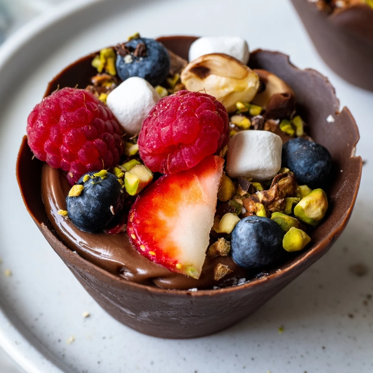 Create stunning chocolate grazing cups with edible chocolate shells filled with silky dark chocolate mousse. These elegant handheld desserts feature layers of creamy mousse topped with vibrant fresh berries, crunchy chopped nuts, mini marshmallows, and chocolate curls. Ready in just over an hour with simple preparation, these luxurious treats are perfect for dessert tables, dinner parties, and special celebrations.