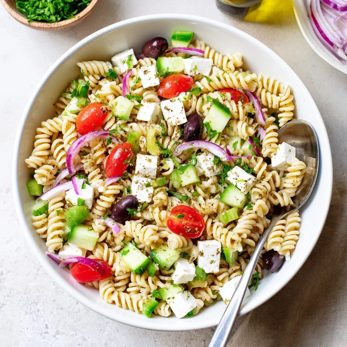 This vibrant Mediterranean bowl brings together al dente pasta with crisp cucumber, cherry tomatoes, red onion, and bell pepper. The star ingredients—creamy feta cheese and briny Kalamata olives—get coated in a classic Greek dressing of olive oil, red wine vinegar, garlic, and oregano. After tossing everything together, chilling for at least 15 minutes lets the flavors meld beautifully. The result is a refreshing dish that works perfectly for summer gatherings, meal prep, or quick weeknight dinners.