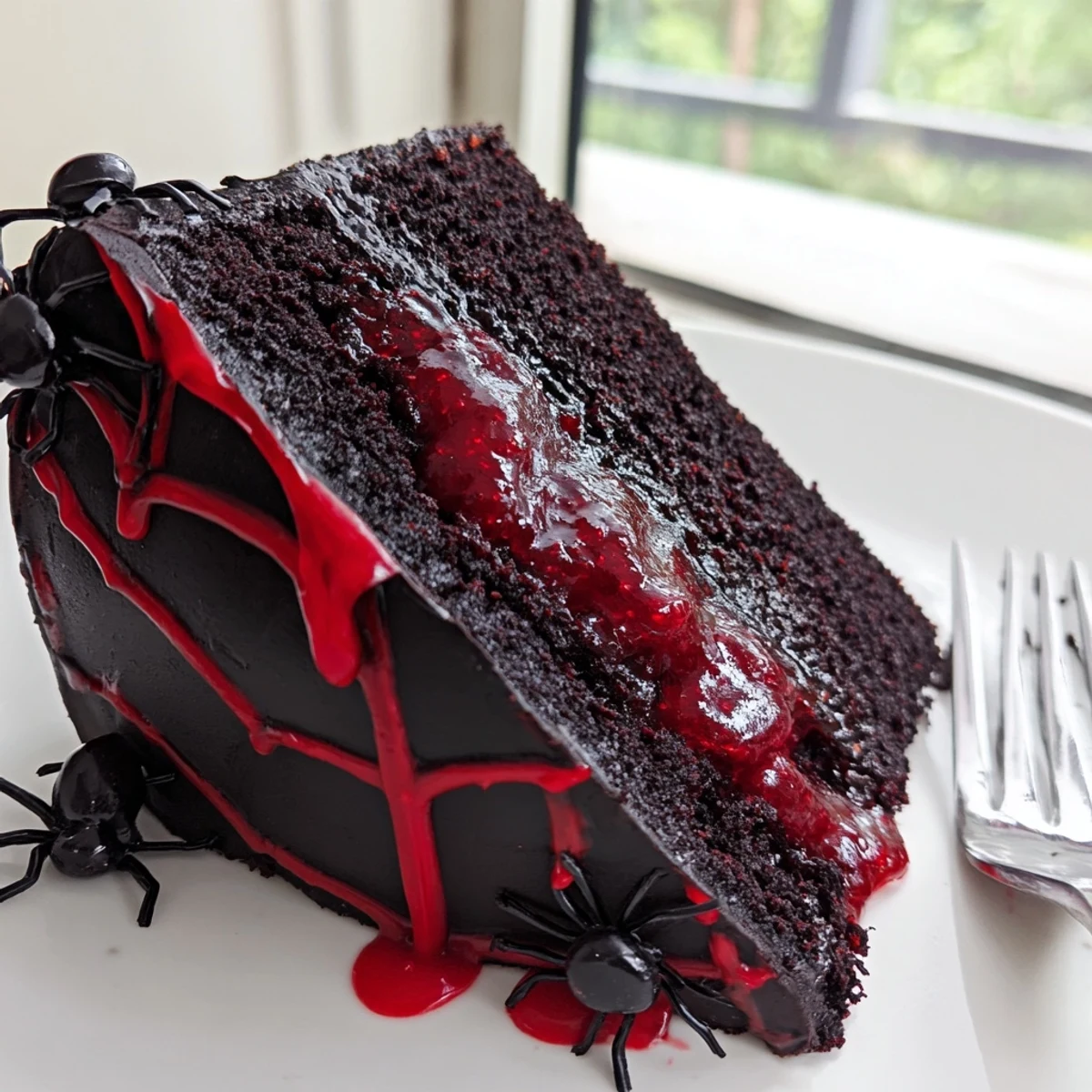 This dramatic dessert features intensely dark chocolate cake layers made with black cocoa powder for an almost-black appearance. Between the layers, a hidden cavity reveals vibrant cherry compote that creates a surprising "bloody" effect when sliced. The entire creation is enveloped in a glossy black cocoa ganache that deepens the dark aesthetic while adding rich chocolate depth. Decorative elements include red gel veining patterns and optional fondant spiders to complete the Halloween theme. The combination of bittersweet chocolate, tart cherries, and creamy ganache creates sophisticated flavors perfect for autumn gatherings.