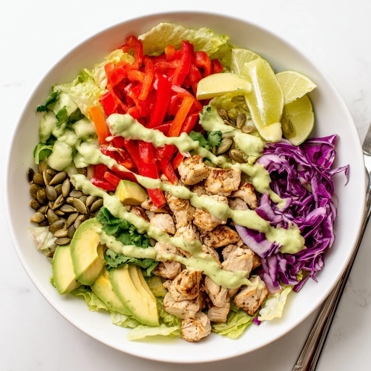 These colorful bowls combine seasoned chicken breast with a rainbow of crisp vegetables including romaine, cucumber, bell peppers, cherry tomatoes, and red cabbage. The star is a luscious avocado-lime dressing that ties everything together. Top with shredded cheese, pumpkin seeds, and fresh cilantro for crunch and flavor. Perfect for meal prep, each bowl delivers complete nutrition while keeping carbohydrates minimal.