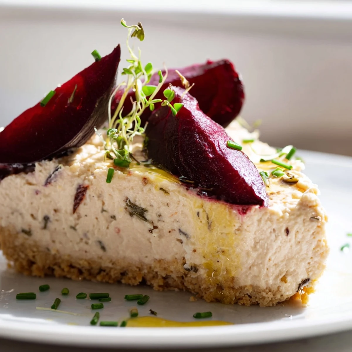 This stunning cheesecake combines a buttery wholemeal cracker base with a velvety smooth filling of cream cheese, ricotta, and mature cheddar. The batter is infused with fresh thyme and lemon zest, then baked until just set with a gentle wobble. Sweet roasted beetroot wedges, caramelized with balsamic vinegar, crown the top alongside fresh chives and peppery microgreens.